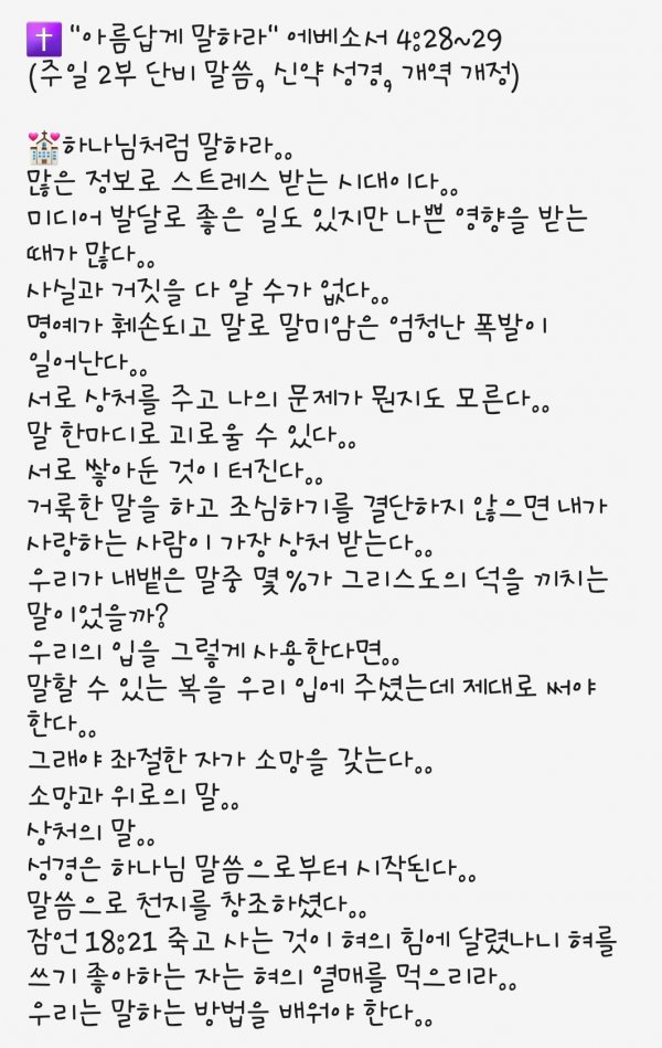 2021년 5월16일 주일예배 전광성 담임목사 "아름답게 말하라" 엡 4:29-30