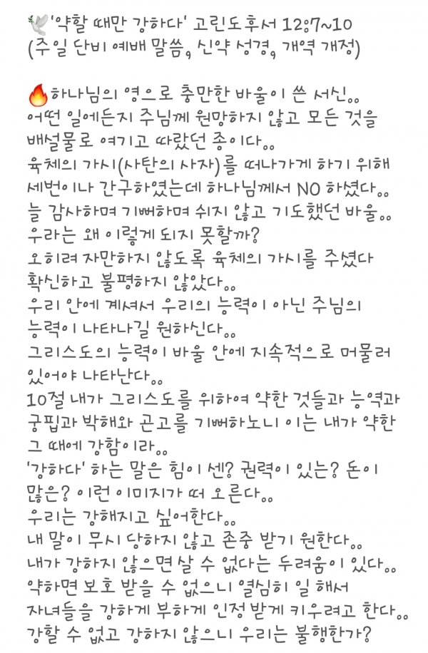 2020년 4월19일 주일예배 전광성 담임목사 "약할 때만 강하다" 고후 12:7-10